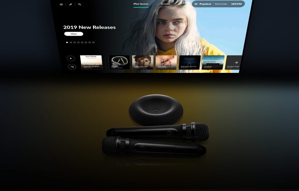 Popsical的硬件十分细巧,类似于电视盒子,随机顺便两支麦克风。把设备连接到电视或显示器上,就可以开唱。用户还可以用移动端APP配对进行点歌和遥控。